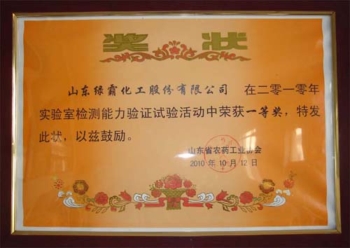 为了提高优秀农药企业的信誉,检验近几年来化验人员参加培训的效果,帮助企业加强实验室内部管理,促进产品质量的提高。山东省农药工业协会组织开展了2010年优秀农药企业实验室检测能力验证试验。山东绿霸公司在此活动中荣获一等奖。