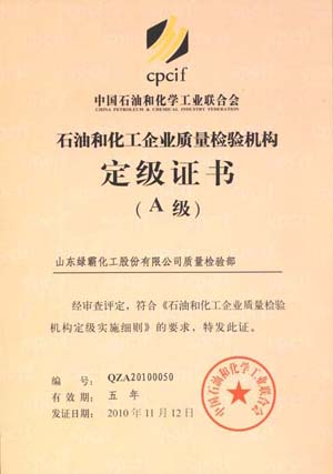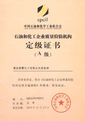 经中国石油和化学工业联合质量安全环保部组织的现场评审和专家审核,确认山东绿霸化工股份有限公司质量检验部符合《石油和化工企业质量检验机构定级实施细则》等文件中A级机构的有关要求授予山东绿霸和潍坊绿霸《石油和化工企业质量检验机构定级证书》。